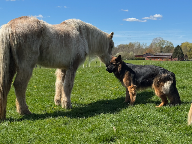 Wir leben zusammen mit unseren Hunden und Pferden in einem Dorf in Schleswig Holstein.