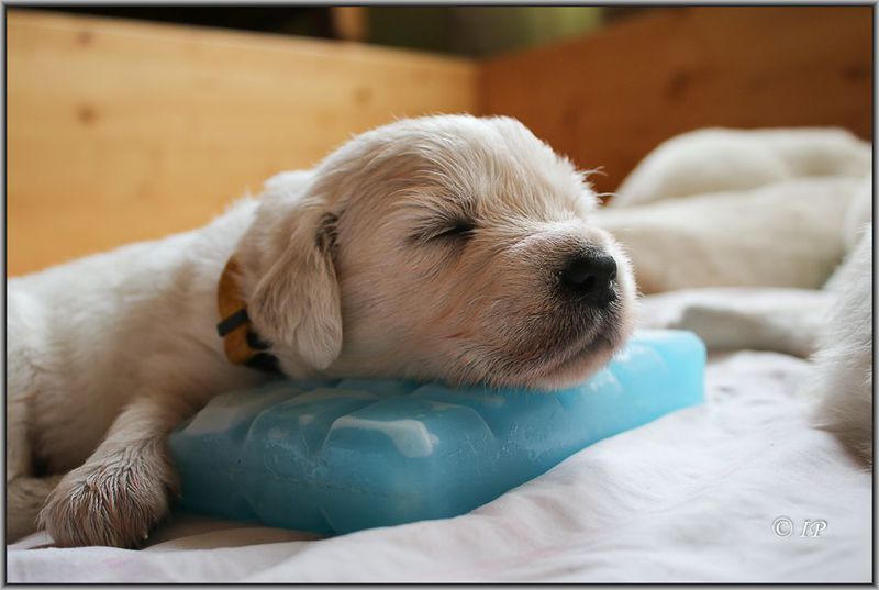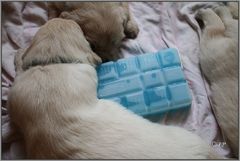 Es ist sooo warm, die Welpen halten es nur mit Kühlpacks und Laken aus Baumwolle aus!