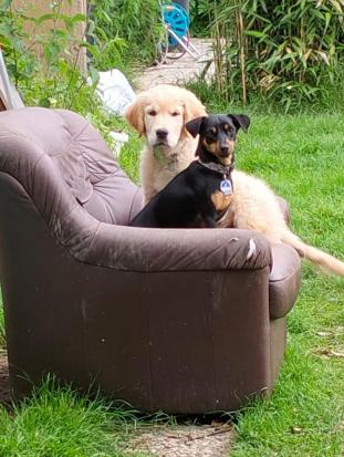 Theo wird heute 7 Jahre alt und ich schicke Dir mal wieder nach langer Zeit ein Foto von unserem tollen Hund Theo, hier mit seinem besten Freund Balu, dem Hund unserer Tochter und ihrem Freund.